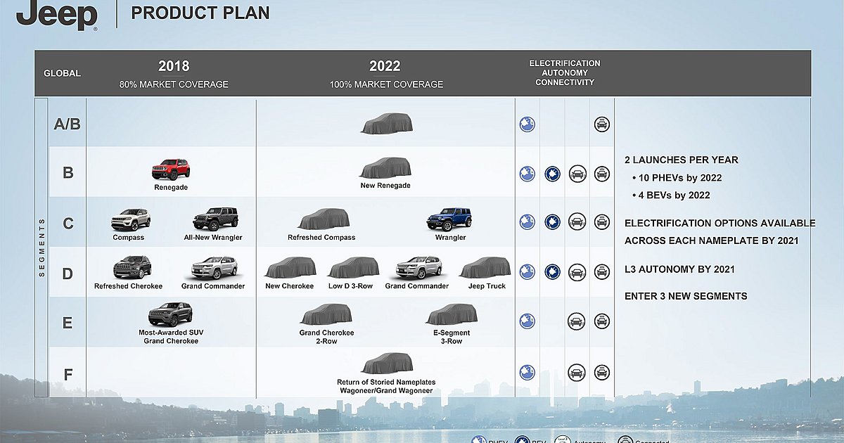 Στα πλάνα του group FCA είναι προφανές πλέον ότι η Jeep έχει τον πρώτο λόγο και το μεγαλύτερο ενδιαφέρον από τα ηγετικά στελέχη της εταιρίας. Έτσι με βάση τις πρόσφατες ανακοινώσεις του Serghio Marchionne, από φέτος και μέχρι το 2022 θα παρουσιάζονται δύο νέα μοντέλα κάθε χρονιά, μεταξύ των οποίων θα υπάρχουν 10 PHEV και 4 αμιγώς ηλεκτρικά.