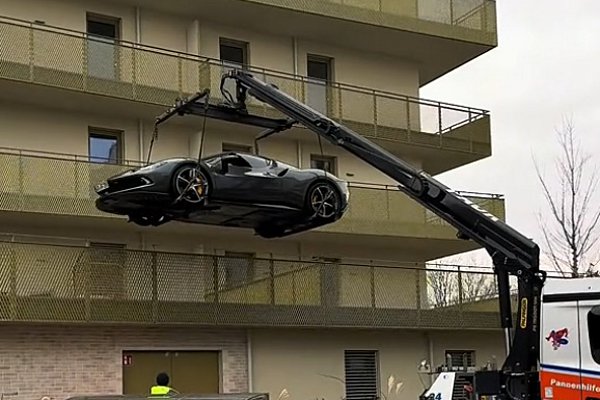 Κι όμως, το supercar των 400.000 ευρώ μεταφέρθηκε με γερανό στο μπαλκόνι του συγκροτήματος κατοικιών. Ωστόσο, λίγες μέρες αργότερα 'αναγκάστηκε' να επιστρέψει στο έδαφος.