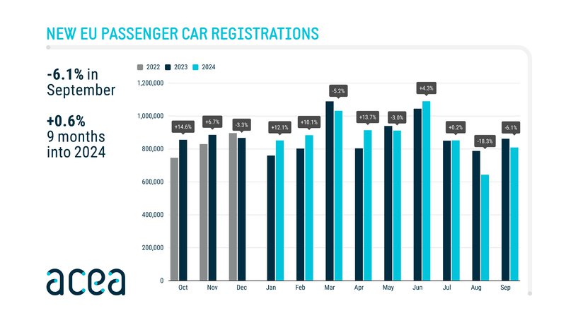 Τον Σεπτέμβριο του 2024, οι ταξινομήσεις νέων αυτοκινήτων στην ΕΕ συνέχισαν την πτωτική τους πορεία, με τη μείωση να φτάνει το 6,1%. Τούτο ήρθε ως αποτέλεσμα της πτωτικής πορείας των πωλήσεων νέων αυτοκινήτων σε τρεις από τις τέσσερις μεγάλες αγορές της Γηραιάς Ηπείρου, δηλαδή τη Γαλλία (-11,1%), την Ιταλία (-10,7%) και τη Γερμανία (-7%). Από την άλλη πλευρά, η Ισπανία παρουσίασε μια υγιή ανάκαμψη της τάξης του 6,3%.