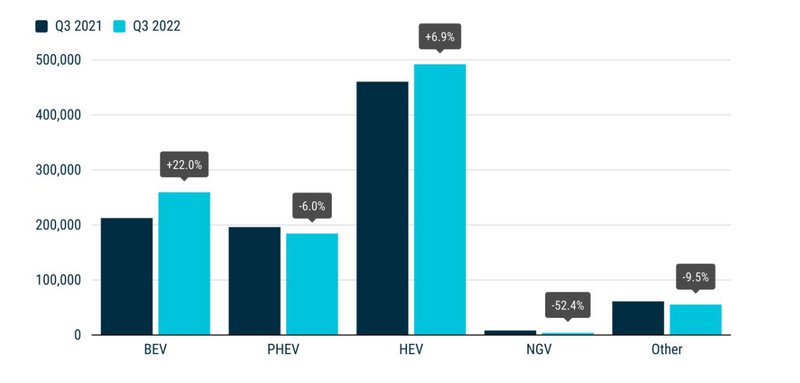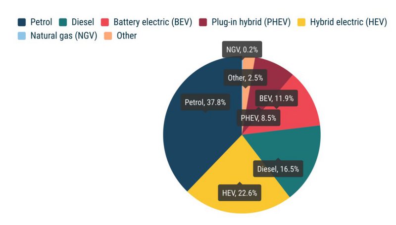 Οι πωλήσεις των υβριδικών (HEV) αυξήθηκαν κατά 6,9% σε σχέση με πέρυσι και έφτασαν τις 492.011 μονάδες, με τη Γερμανία να είναι η μοναδική μεγάλη αγορά στην οποία σημειώθηκε πτώση στη συγκεκριμένη κατηγορία κατά 1,5%.