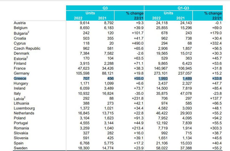 Στην κατηγορία των ηλεκτρικών άνοδος σημειώθηκε και στην ελληνική αγορά η οποία έφτασε το 55%. Συγκεκριμένα το τρίτο τρίμηνο του 2021 η Ελλάδα είχε ταξινομήσει 456 EV ενώ φέτος ο αριθμός ανέβηκε στις 707.