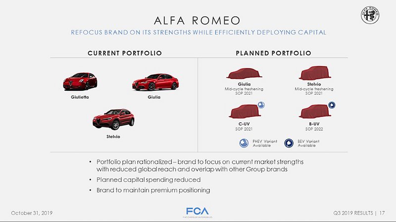 Σύμφωνα με δηλώσεις του CEO του γκρουπ FCA, Michael Manley, τα σχέδια για την επέκταση της γκάμας της Alfa Romeo θα μειωθούν σημαντικά, κάτι που θα φέρει και μείωση στα λειτουργικά κόστη. "Πρέπει να σιγουρέψουμε τα κέρδη της εταιρίας και γι' αυτό θα αναθεωρήσουμε τα σχέδιά μας σε ό,τι έχει να κάνει με τις κατηγορίες οχημάτων που θα είναι παρούσα η Alfa Romeo".