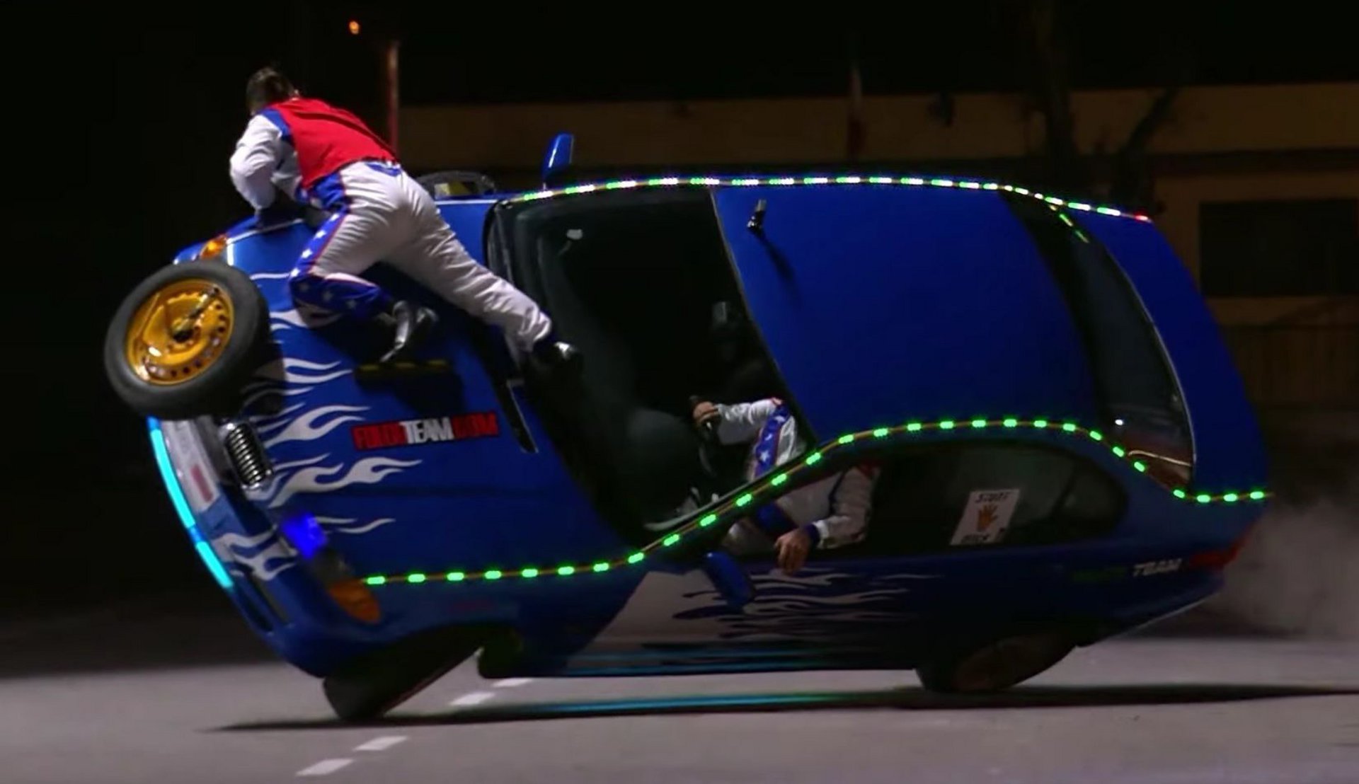 Η διαδικασία θυμίζει περισσότερο καλοστημένη χορογραφία, καθώς ο Zoldan ανασηκώνει την BMW στις δύο ρόδες, προκειμένου να μπορέσει ο Folco να σκαρφαλώσει εκτός της καμπίνας για να αλλάξει το ελαστικό.