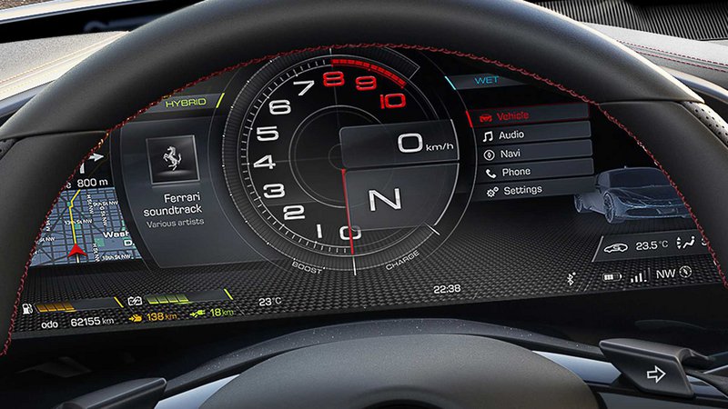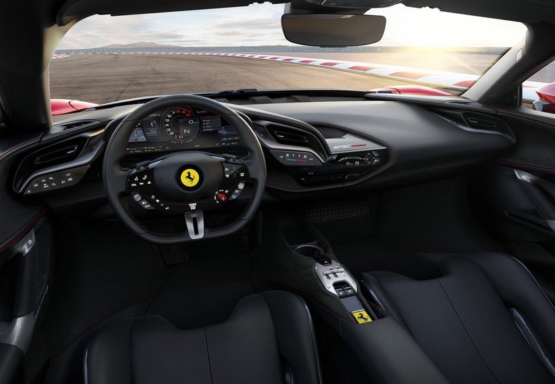Στο κόκπιτ ο οδηγός έχει μπροστά του μια μεγάλη οθόνη 16 ιντσών που υποστηρίζει head-up display και συνδυάζεται άψογα με το πολύ-λειτουργικό τιμόνι με το όλο σύνολο η Ferrari να το αποκαλεί EOTR-HOTW (Eyes On The Road - Hands On The Wheel). Από το γνωστό Manettino ο οδηγός μπορεί να επιλέξει τέσσερα διαφορετικά προφίλ κίνησης: το eDrive (για ηλεκτροκίνηση 25 km σε ταχύτητες έως 135 km/h, μπαταρία 7,9 kWh), το Hybrid, το Performance και το Qualify για μέγιστη ισχύς.