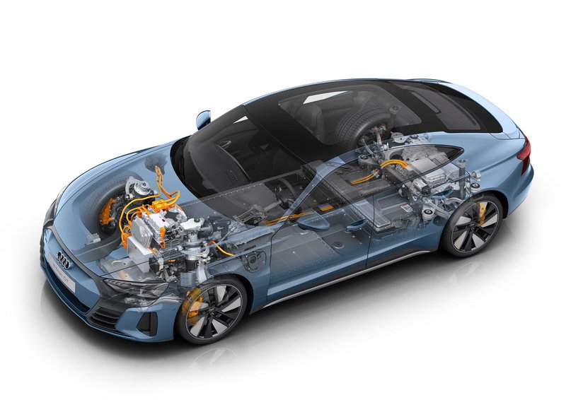 Η ηλεκτρική τετρακίνηση υλοποιείται με έναν «σύγχρονο» ηλεκτροκινητήρα σε κάθε άξονα και με μετάδοση δύο ταχυτήτων στον πίσω άξονα. Η πρώτη «κοντή» ταχύτητα επιτρέπει βέλτιστη επιτάχυνση όταν γίνεται εκκίνηση με το launch control. Εάν ο οδηγός αποφασίσει να μην κάνει χρήση αυτής της επιλογής, το e-tron GT ξεκινά με τη δεύτερη ταχύτητα. Σε γενικές γραμμές, η δεύτερη σχέση βελτιώνει τον βαθμό ενεργειακής απόδοσης και παρέχει επίσης μεγάλες ποσότητες εφεδρικής ισχύος. Ο ηλεκτρικός κινητήρας, τα ηλεκτρονικά ισχύος και το κιβώτιο ταχυτήτων αποτελούν ένα συμπαγές μπλοκ και στους δύο άξονες.