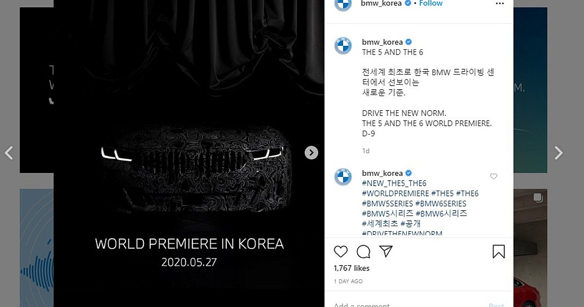 Η εικόνα δεν αποκαλύπτει πολλά, αποδεικνύει όμως τη δύναμη που έχουν σήμερα τα social media. Σε μία ανάρτηση στο Instagram, η BMW δίνει την Τετάρτη, 27 Μαΐου ως την ημέρα της παρουσίασης των ανανεωμένων Σειρών 5 και 6 GT. Η ανάρτηση έγινε από το λογαριασμό της BMW Νότιας Κορέας και παρουσιάζει μία σκοτεινή μάσκα, με τα χαρακτηριστικά φωτιστικά σώματα και την ημερομηνία της παρουσίασης. Λίγο αργότερα, ωστόσο, ακολούθησε άλλη μία ανάρτηση, στην οποία εναλλάσσονται φευγαλέα όλες οι προσόψεις των παλαιών Σειρών 5, μέχρι και τη σημερινή, καταλήγοντας αντίστοιχα στο ίδιο event.