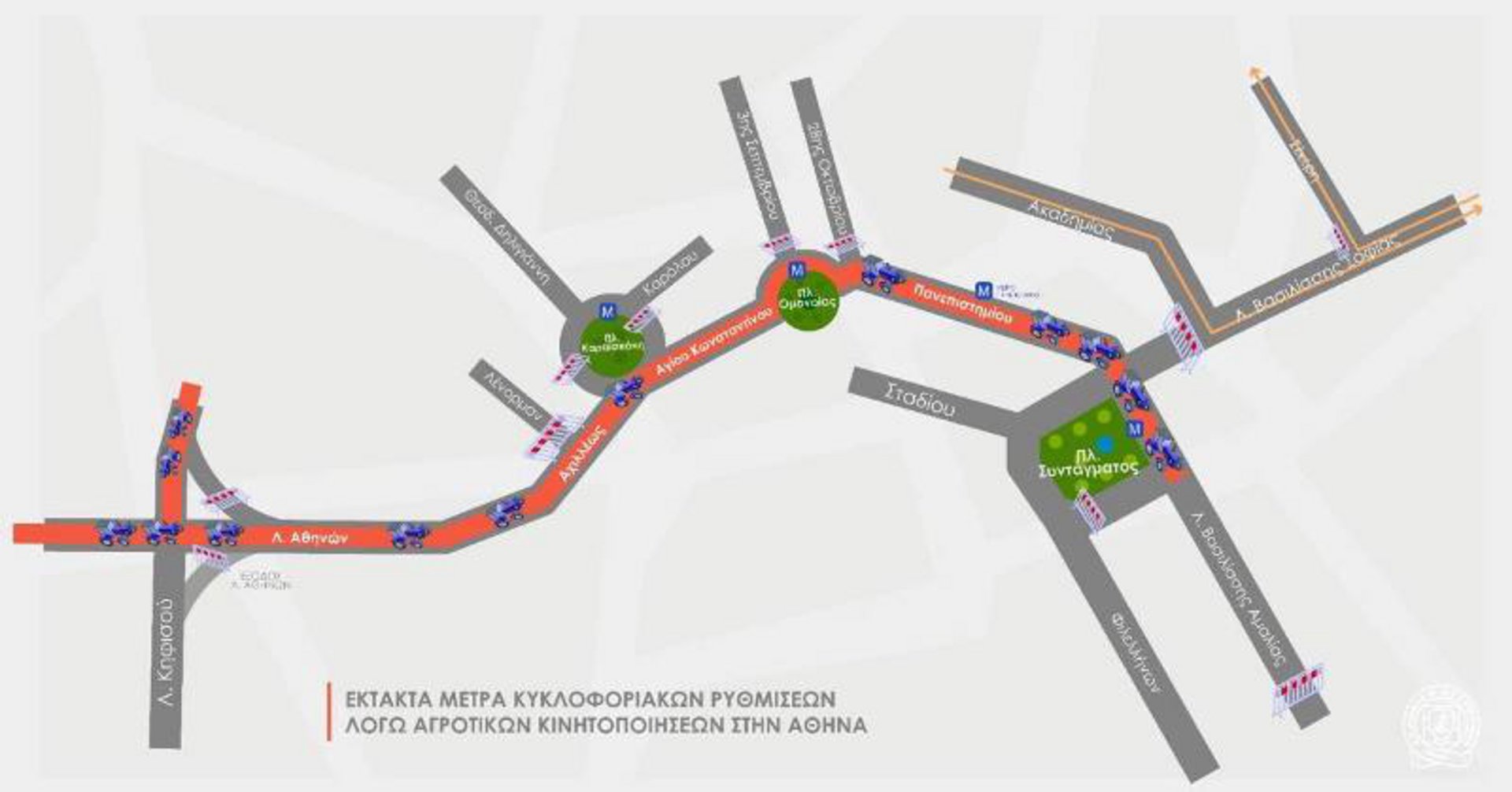 - Προσωρινή διακοπή της κυκλοφορίας κατά μήκος του δρομολογίου που θα ακολουθήσουν τα αγροτικά οχήματα: Λεωφόρος Αθηνών, Αχιλλέως, πλατεία Καραϊσκάκη. Θα κινηθούν αντίθετα στην οδό Αγίου Κωνσταντίνου, την πλατεία Ομονοίας και την οδό Πανεπιστημίου, προκειμένου να φθάσουν στο Σύνταγμα. Θα υπάρξει προσωρινή διακοπή της κυκλοφορίας πέριξ της πλατείας Ομονοίας.