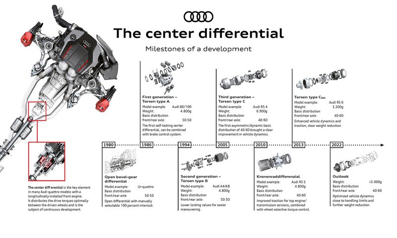 5 κιλά ήταν το κατά προσέγγιση βάρος του πρώτου μπλοκέ κεντρικού διαφορικού Torsen που χρησιμοποιήθηκε στο αρχικό Audi quattro, το 1986. Η βασική κατανομή ήταν 50:50 μεταξύ του εμπρός και του πίσω άξονα. Σήμερα, το μπλοκέ κεντρικό διαφορικό Torsen στα μοντέλα με διαμήκη τοποθέτηση κινητήρων ζυγίζει μόνο περίπου 3 κιλά και έχει βασική κατανομή 40% στον μπροστινό άξονα και 60% στον πίσω άξονα.