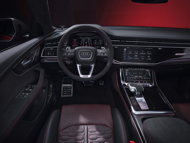 Στο εσωτερικό, η Audi έχει τοποθετήσει μια οθόνη 12,3 ιντσών στη μεριά του οδηγού, που τελεί χρέη ψηφιακού πίνακα οργάνων, ενώ υπάρχουν ακόμη δύο οθόνες στην κεντρική κονσόλα, μια 10,1 ιντσών για τον χειρισμό του συστήματος infotainment και μια 8,6 ιντσών για το σύστημα κλιματισμού. Το ύφασμα Alcantara κυριαρχεί, σε αντίθεση με το απλό Q8.