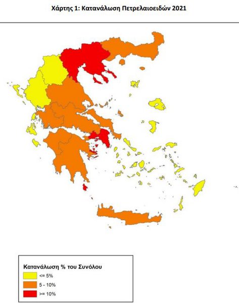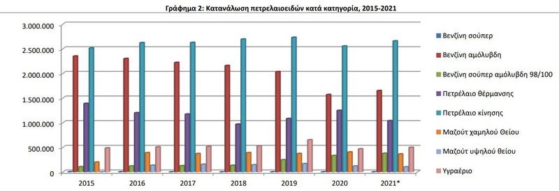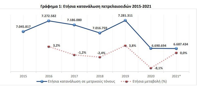 Σύμφωνα με τα στοιχεία αυτά, δεν παρατηρείται σημαντική μεταβολή της συνολικής κατανάλωσης πετρελαιοειδών για το έτος 2021 σε σχέση με το έτος 2020, με τις αντίστοιχες ποσότητες να ανέρχονται σε 6.687.434 μετρικούς τόνους για το έτος 2021 και 6.690.694 μετρικούς τόνους για το έτος 2020.