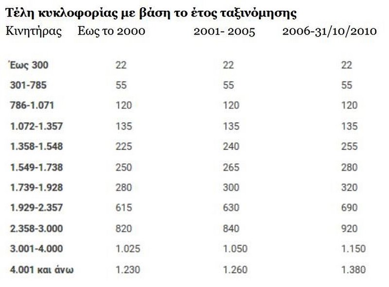 Οι ιδιοκτήτες των αυτοκινήτων με 1η Άδεια Κυκλοφορίας πριν την 31/12/2000, από 1/1/2001 έως 31/12/2005 και από 1/1/2006 έως 31/10/2010 θα πληρώσουν από 22 ευρώ έως 1.380 ευρώ ανάλογα με τον τύπο, τον κυβισμό και το έτος ταξινόμησης.