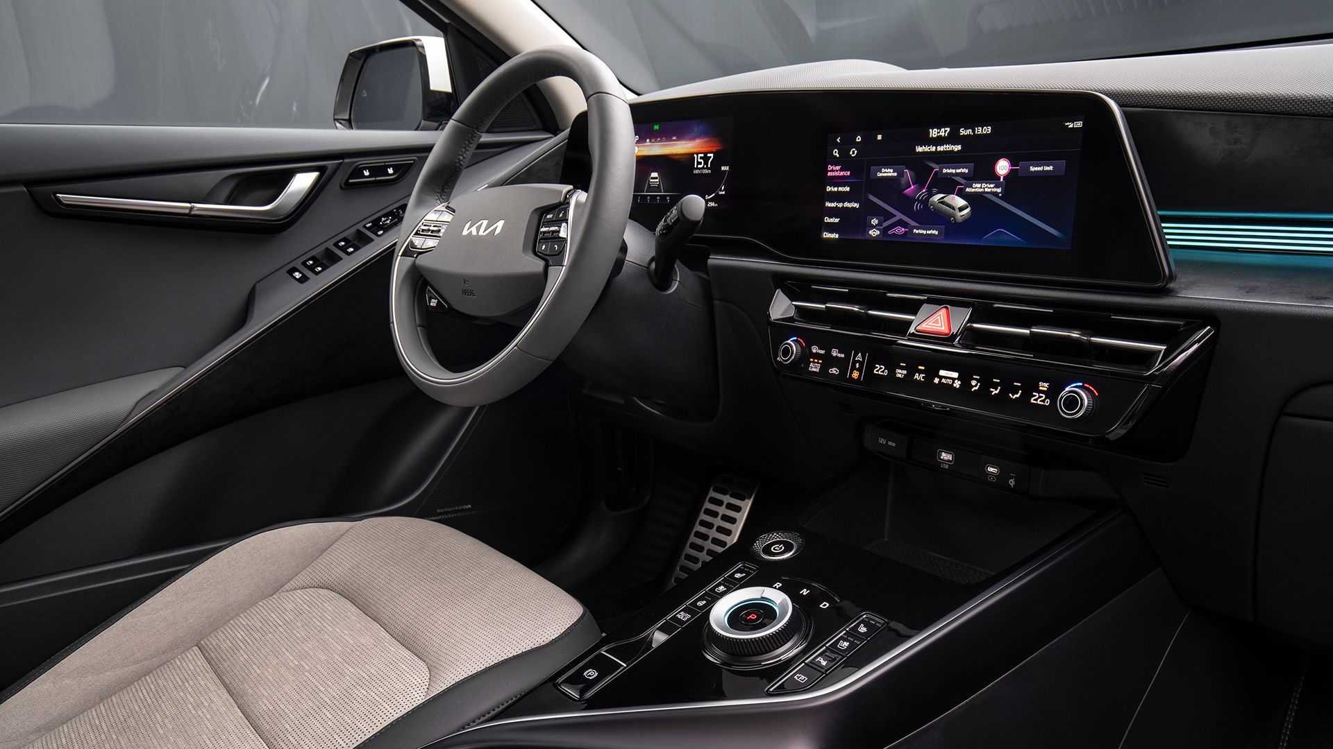 Στο εσωτερικό κυριαρχούν οι οριζόντιες και διαγώνιες γραμμές που πλαισιώνονται ιδανικά με τον πλούσιο ατμοσφαιρικό φωτισμό. Το ταμπλό ενσωματώνει τις δύο οθόνες (μία για τον ψηφιακό πίνακα οργάνων και μία κεντρική αφής) σε μία ενιαία διάταξη με τα κουμπιά αφής του συστήματος κλιματισμού ξεχωριστά τοποθετημένα ακριβώς από κάτω. Χαμηλότερα υπάρχει ο περιστροφικός διακόπτης για το κιβώτιο ταχυτήτων.
