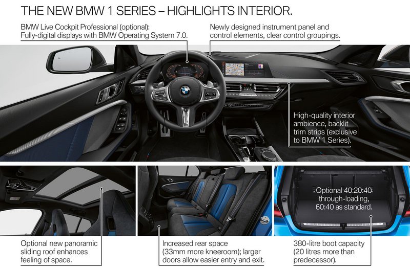 Σύμφωνα με την BMW η νέα Σειρά 1 μπορεί να υπολείπεται σε μήκος 5 mm (συνολικό στα 4.319 mm) και το μεταξόνιο της να είναι 20 mm μικρότερο (στα 2.670 mm) αλλά η απουσία του τούνελ μετάδοσης και η έξυπνη σχεδίαση της καμπίνας προσφέρουν σημαντικά μεγαλύτερους χώρους για τους πίσω επιβάτες (33 mm μεγαλύτερος χώρο για τα γόνατα). Μάλιστα το πορτμπαγκάζ είναι μεγαλύτερο κατά 20 lt φτάνοντας συνολικά τα 380 lt.