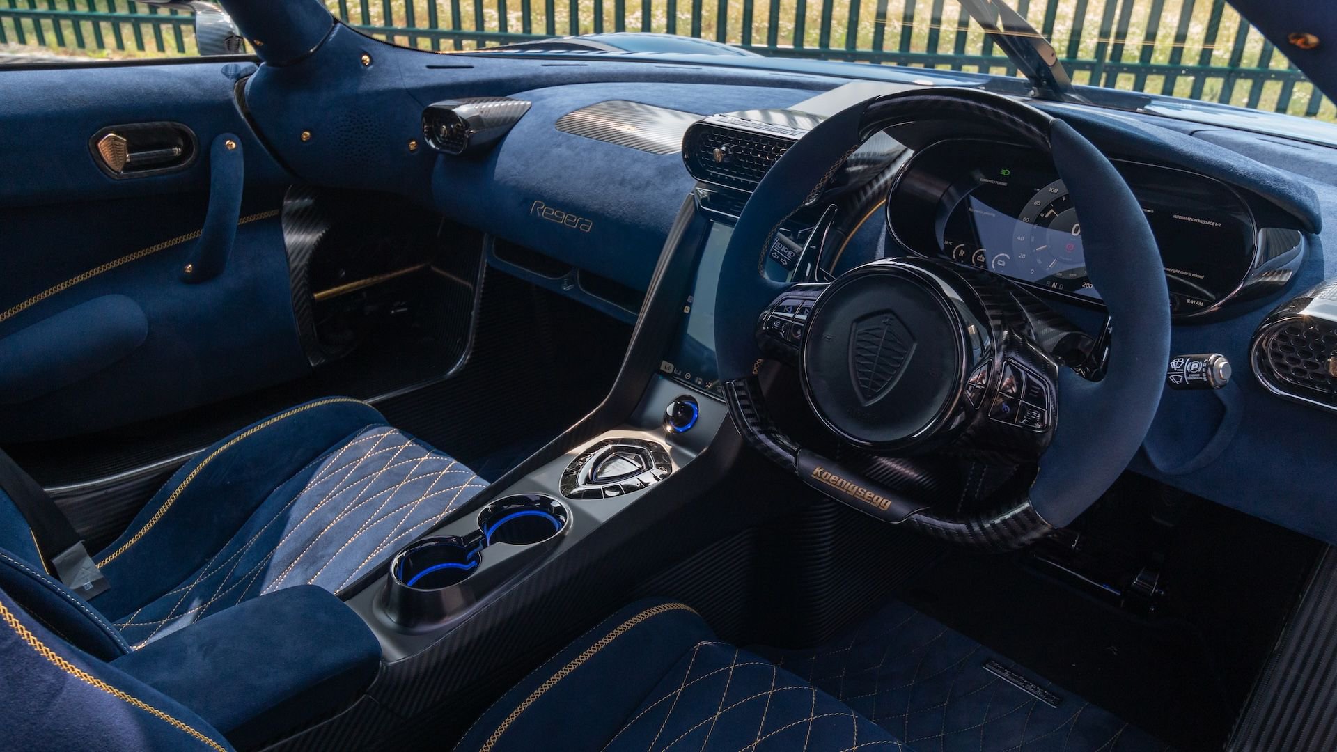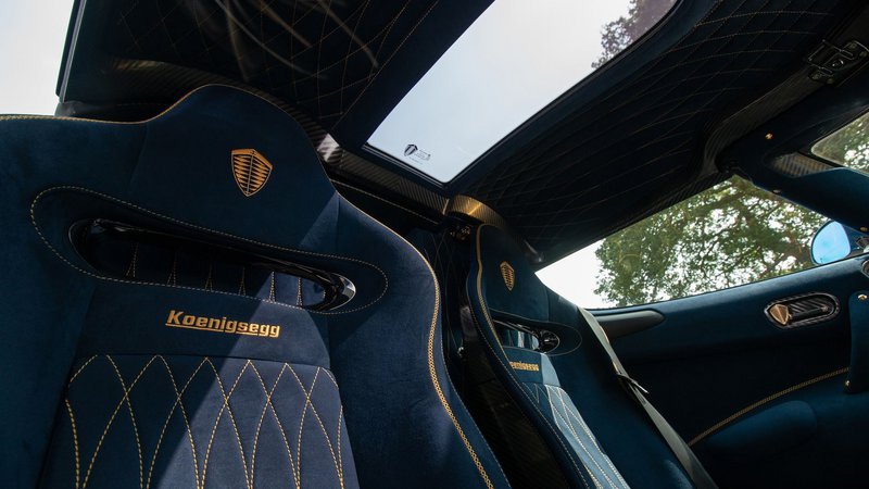 Και το εσωτερικό έχει λάβει αντίστοιχη μεταχείριση κι ο οδηγός φαίνεται ότι αγαπά ιδιαίτερα τον χρυσό. Τα καθίσματα, το ταμπλό, τα πάνελ των θυρών και το τιμόνι έχουν ντυθεί με ύφασμα Alcantara σε μπλε χρώμα και συνδυάζονται με χρυσές λεπτομέρειες και ραφές. Φυσικά, το ανθρακόνημα δε λείπει από την καμπίνα, όπως βέβαια και στις περισσότερες μονάδες της Regera που έχουμε δει.