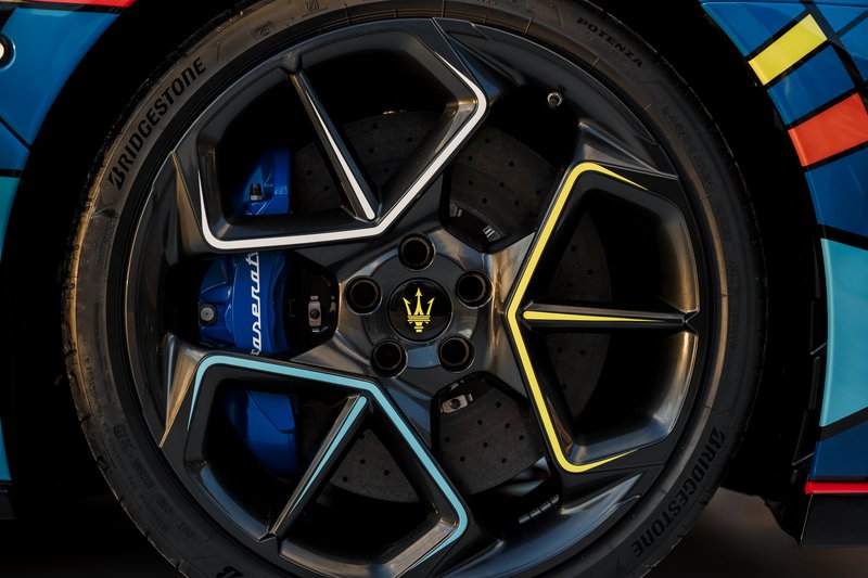 Το σήμα κατατεθέν της Maserati εμφανίζεται και στους ειδικούς τροχούς, που φέρουν τρεις τρίαινες που κοιτούν προς το κέντο της ζάντας. Καθεμιά από αυτές έχει βαφεί σε κίτρινο, τιρκουάζ και λευκό χρώμα.
