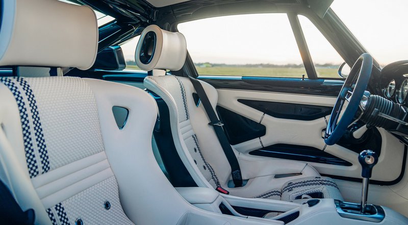 Στο εσωτερικό, η Singer έχει καλύψει τις περισσότερες επιφάνειες με δέρμα σε κρεμ χρώμα, ενώ υπάρχουν και αρκετές λεπτομέρειες από ύφασμα Alcantara, όπως για παράδειγμα το τιμόνι, αλλά και το ανθρακόνημα σε ορισμένα σημεία.