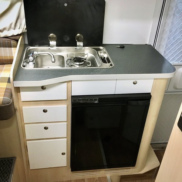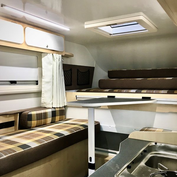 Στο εσωτερικό υπάρχει χώρος για έως και τρία άτομα. Δύο κοιμούνται σε ένα κρεβάτι στην εσοχή, ενώ το τρίτο μέλος του πληρώματος αρκείται σε έναν πάγκο που αποτελεί μέρος της τραπεζαρίας. Υπάρχουν, επίσης, μια μικρή κουζίνα και ένα μπάνιο με τουαλέτα και ντους. Η δεξαμενή καθαρού, πόσιμου νερού έχει χωρητικότητα 60 λίτρων και η δεξαμενή για το νερό "κοινής χρήσης" 40 λίτρα. Υπάρχει επίσης σύστημα θέρμανσης, κλιματισμός, κουζίνα αερίου και ψυγείο. Έτσι, υπάρχουν όλα όσα θα βρείτε σε ένα κανονικό τροχόσπιτο.