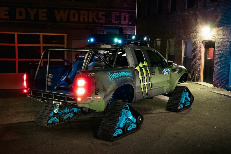 Στην καμπίνα υπάρχουν ακόμη δύο καθίσματα Recaro, ενώ το αμάξωμα έχει ντυθεί με ένα ειδικό livery με τα σήματα της Monster, της Ford και των Hoonigan. Προσφέρεται κι ένα σετ συμβατικών τροχών, για όταν το F-150 RaptorTRAX κάνει εξορμήσεις σε λιγότερο απαιτητικά μονοπάτια.