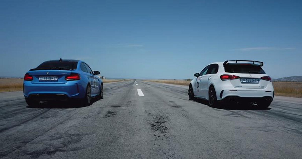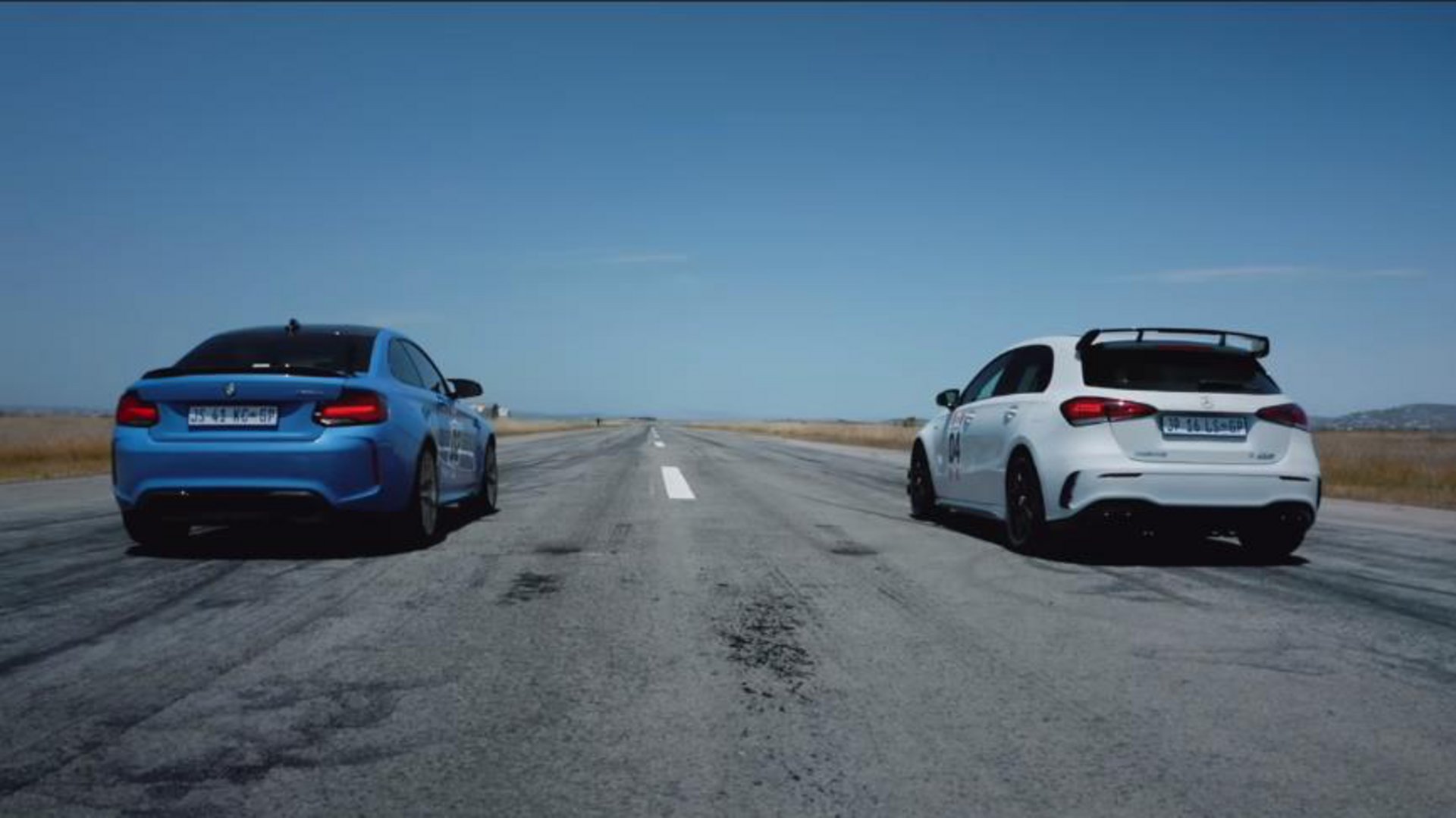 Αν και ο οδηγός της Α45S φαίνεται να καθυστερεί αρκετά να ξεκινήσει, το hatchback της Mercedes εκμεταλλεύεται την τετρακίνηση και παίρνει γρήγορα κεφάλι, κάνοντας το 0-100 χλμ/ώρα σε 4,2 δευτερόλεπτα, όταν η BMW χρειάζεται 4,48 δευτερόλεπτα.