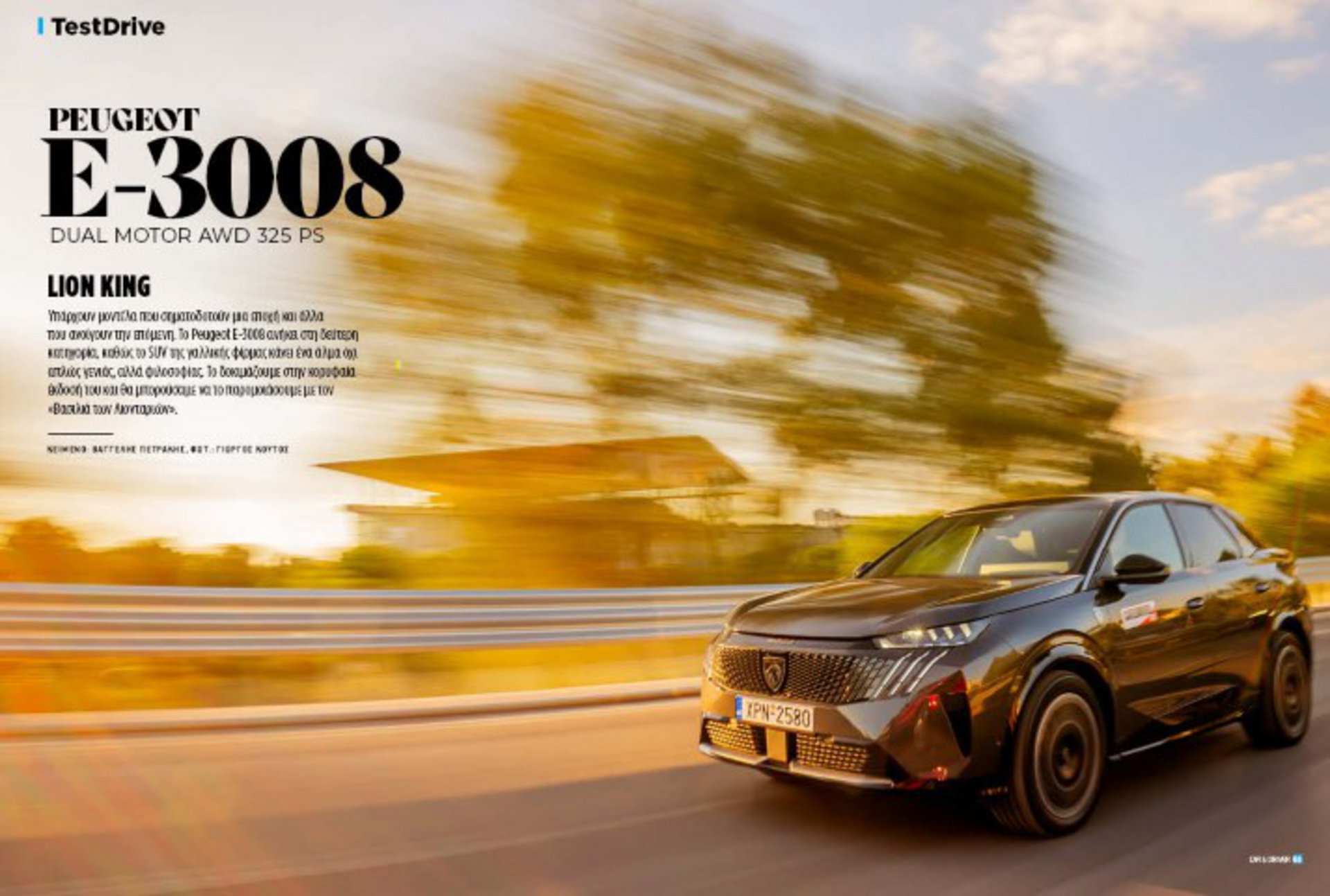 Η πρώτη δοκιμή στην Ελλάδα του Peugeot E-3008 Dual Motor AWD με ισχύ 325 ίππων παρουσιάζει ένα SUV που ενσωματώνει δύναμη, τεχνολογική υπεροχή και κομψότητα. Το νέο ηλεκτρικό μοντέλο της Peugeot συνδυάζει επιδόσεις και αποδοτικότητα, με προηγμένες δυνατότητες τετρακίνησης που ενισχύουν τον χαρακτήρα του.