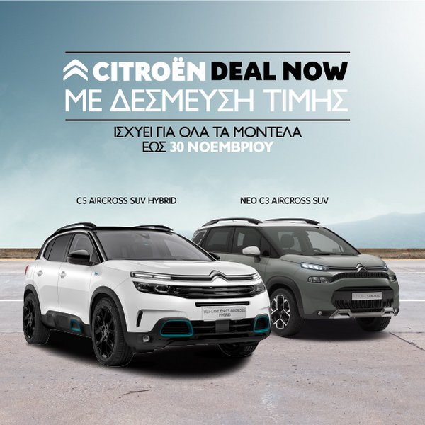 Η Citroen Hellas αντιλαμβανόμενη τις ιδιαίτερες συνθήκες που επικρατούν στην αγορά αυτοκινήτου, με το πρόγραμμα “CITROEN DEAL NOW”, δίνει τη δυνατότητα στους πελάτες της Μάρκας που προβαίνουν σε παραγγελία να “δεσμεύσουν” τη λιανική τιμή αγοράς.