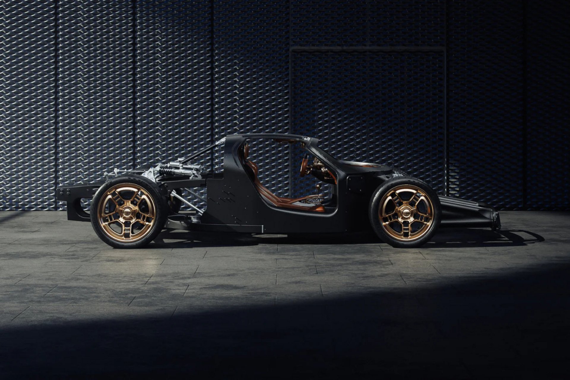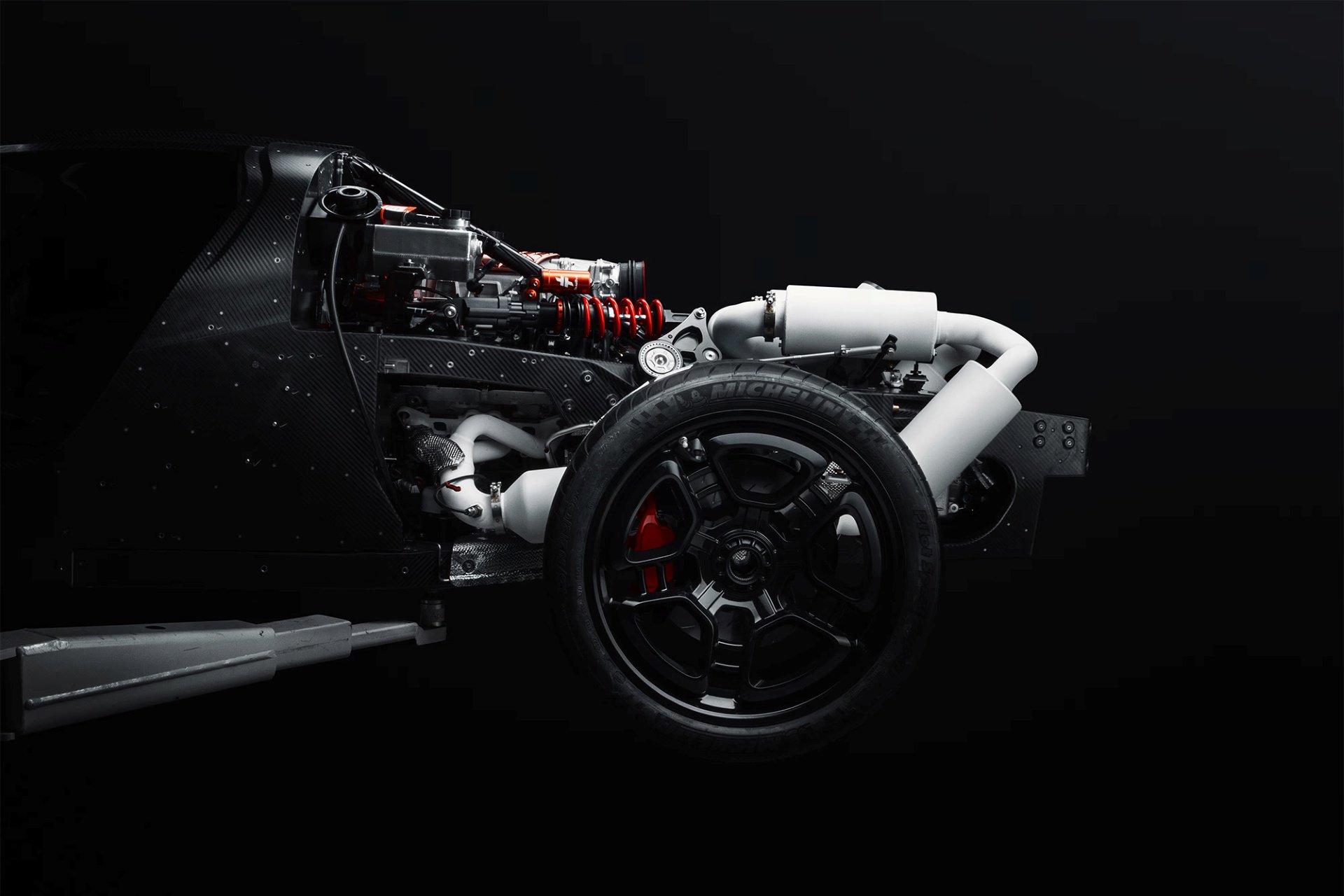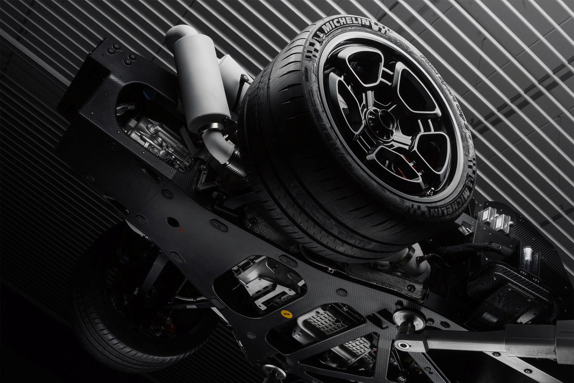 Το εσωτερικό ακολουθεί τη φιλοσοφία της αγνότητας: κανένα ψηφιακό σύστημα, οθόνες ή τεχνολογικά τρικ δεν αποσπούν τον οδηγό από την ουσία της εμπειρίας. Λευκό χειροποίητο δέρμα, άβαφα ανθρακονήματα και χειροποίητα μεταλλικά όργανα (όλα σε ροζ-χρυσό φινίρισμα) συνθέτουν μια καμπίνα που περισσότερο θυμίζει κοκπιτ κλασικού αγωνιστικού παρά σύγχρονο supercar.