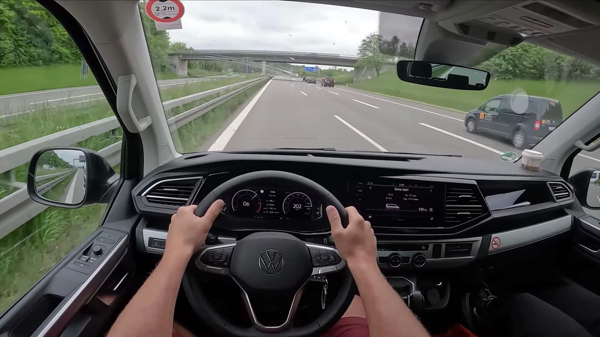 Ο οδηγός στο βίντεο περνά το μεγαλύτερο μέρος στην αριστερή λωρίδα, και μετά από λίγη ώρα επιταχύνει για να φτάσει μέγιστη τελική ταχύτητα 202 km/h. Όλα κυλούν ομαλά, και το Multivan μοιάζει αρκετά σταθερό ακόμα και σε αυτές τις ταχύτητες.