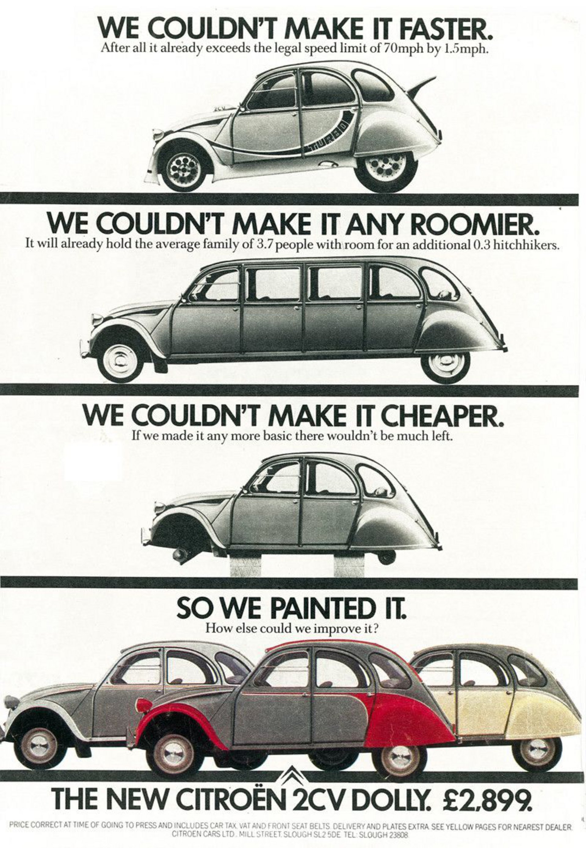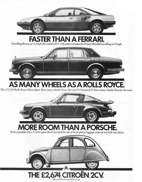 Συγκρατώντας αυτά, παραθέτουμε τρεις διαφημίσεις της Citroen, με εμφανώς χιουμοριστική διάθεση. Το να διακωμωδείς το ίδιο σου το αυτοκίνητο με στόχο να το συμπαθήσει ο κόσμος και να πουλήσει, δεν είναι κάτι που συναντάμε στις μέρες μας. όπως θα δείτε και στις αφίσες, ένα 2CV με τελική ταχύτητα 71,5 μίλια ανά ώρα, μπορεί να προσπεράσει μία Ferrari που κινείται χαλαρά με 65 μίλια/ ώρα! Ένα 2CV πάλι, με τέσσερις θέσεις, προσφέρει 0,3 θέσεις περισσότερες από αυτές που χρειάζεται η μέση οικογένεια, 3,7 ατόμων. Τέλος, δεν υπάρχει τίποτα σε ένα 2CV να χαλάσει, αφού δεν προσφέρει και τίποτα! Πραγματικά, αυτά θα μπορούσαν να είναι και ανέκδοτα, αν δεν ήταν επίσημες καταχωρήσεις της εταιρίας!