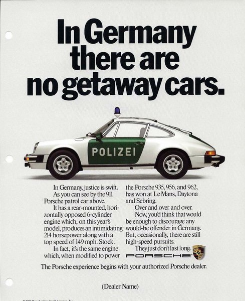 Σε άλλες πάλι καταχωρήσεις, έβρισκε να βγάλει το άχτι της, μειώνοντας εταιρίες οι οποίες καμία σχέση δεν είχαν με την ίδια. Πιθανά κανένα παιδί δεν ονειρεύεται κάποια μέρα να αποκτήσει ένα Mitsubishi, αυτό όμως πως μπορεί να βοηθήσει την 911; Υπήρξαν ωστόσο και άλλες καταχωρήσεις, που ήταν όντως απολαυστικές. Στη Γερμανία δεν υπάρχουν αυτοκίνητα διαφυγής, καθώς η αστυνομία οδηγεί 911! Τα μεταχειρισμένα της φίρμας δίνουν εγγύηση ενός έτους ή ενός εκατομμυρίου χιλιομέτρων, Ο,τι έρθει πρώτο! Αυτά ναι, έκαναν όλους τους φίλους της φίρμας να χαμογελούν.