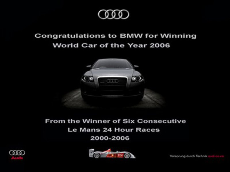 Υπάρχουν όμως και διαφημίσεις που λειτουργούν σαν ντόμινο. Ξεκινούν από κάπου και ακολουθούν μία αναπάντεχη τροπή. Χαρακτηριστική ήταν μία καταχώρηση της BMW, που έδινε συγχαρητήρια στην Audi για την κατάκτηση του South African Car of the Year 2006, Από το νικητή του «World Car of the Year 2006». Όπως εύκολα αντιλαμβάνεστε, αυτό δεν έπεσε έτσι κάτω. Η Audi συνεχάρη με τη σειρά της τη BMW για την κατάκτηση αυτού του τίτλου, ως ο νικητής έξι συνεχόμενων Le Mans! Και εκεί που όλα έδειχναν να λήγουν, ολοκλήρωσε την τριάδα η Subaru, στέλνοντας ευχές στους νικητές των «καλλιστείων», από το νικητή του 2006 International Engine of the Year.