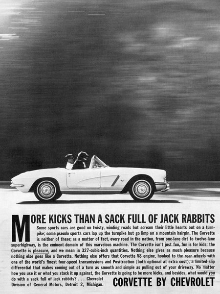 Η εν λόγω καταχώρηση απευθύνεται στην Αμερικάνικη αγορά. Αυτό τουλάχιστον προδίδει το χιούμορ που χρησιμοποιεί ο διαφημιστής. Μία Corvette «κλωτσάει» περισσότερο από ένα σακί λαγούς. Πιθανά για να πειστεί ο κάθε redneck ότι το αυτοκίνητο είναι καλό. Και όπως τελειώνει και το σχετικό σημείωμα, «στο κάτω κάτω, τι να το κάνεις ένα σακί λαγούς»;