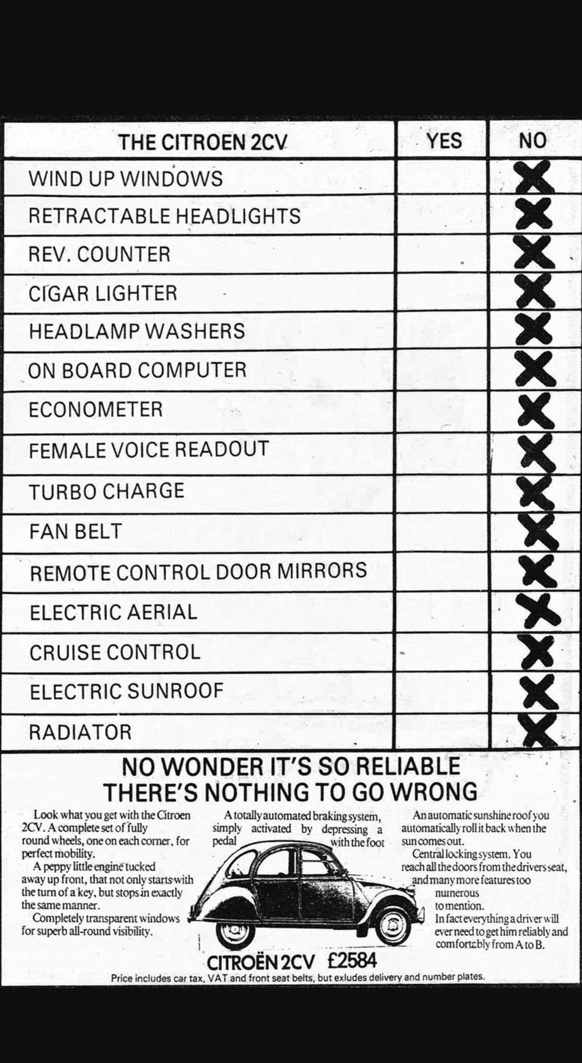 Σαν αυτοκίνητο δεν μπορεί κανείς να αμφισβητήσει ότι ήταν μπροστά από την εποχή του. Εγκυκλοπαιδικά, σχεδιάστηκε τη δεκαετία του ’40, με στόχο να αποτελέσει ένα φτηνό και όσο το δυνατό πιο απλό και ανθεκτικό όχημα για τους αγρότες της Γαλλίας, που ακόμα επέμεναν στα κάρα. Μάλιστα, η επαναστατική του ανάρτηση διαφημιζόταν με ένα 2CV που περνούσε μέσα από ένα φρεσκοοργωμένο χωράφι, κουβαλώντας αυγά χωρίς να τα σπάσει!