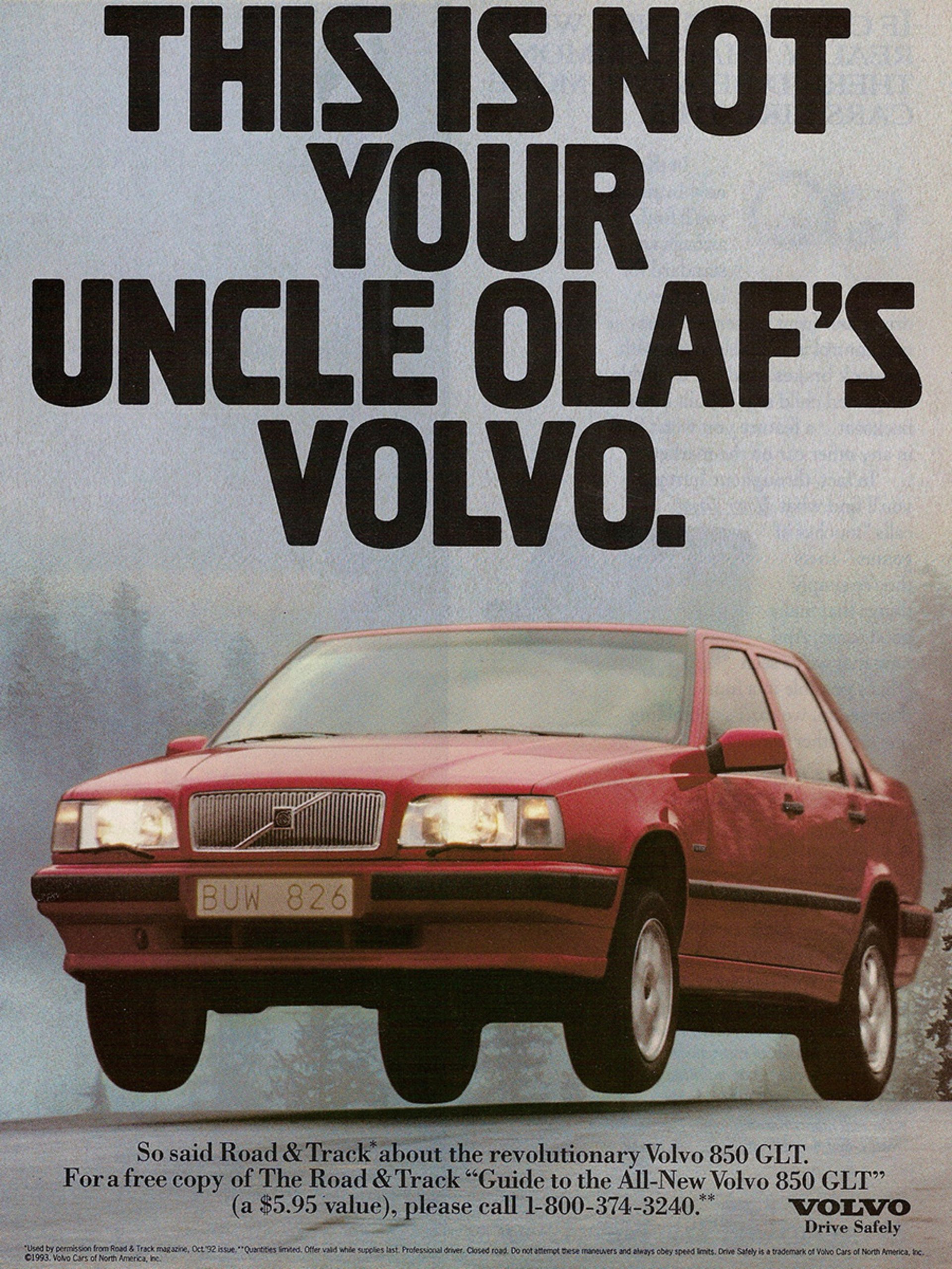 Για όσους δεν γνωρίζουν, μέχρι τις αρχές της δεκαετίας του ’90, η Volvo πρέπει να αποτελούσε μία από τις πιο ασφαλείς και συνάμα πιο αδιάφορες εμφανισιακά και οδηγικά εταιρίες του πλανήτη. Το πρώτο ουσιαστικά μοντέλο της νέας εποχής της φίρμας ήταν το 850. Και η Volvo έπρεπε να βρει ένα δυνατό μήνυμα να αφυπνίσει το κοινό. Με κάθε εκτίμηση προς τον θείο Olaf.