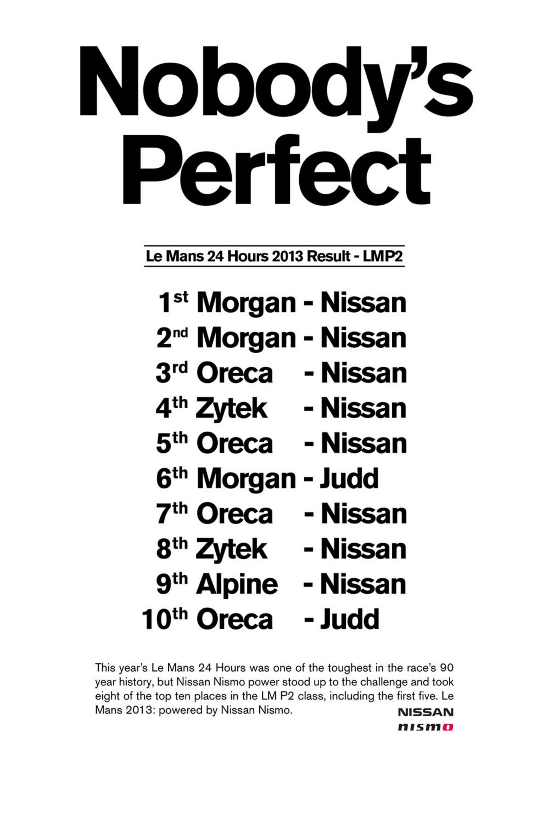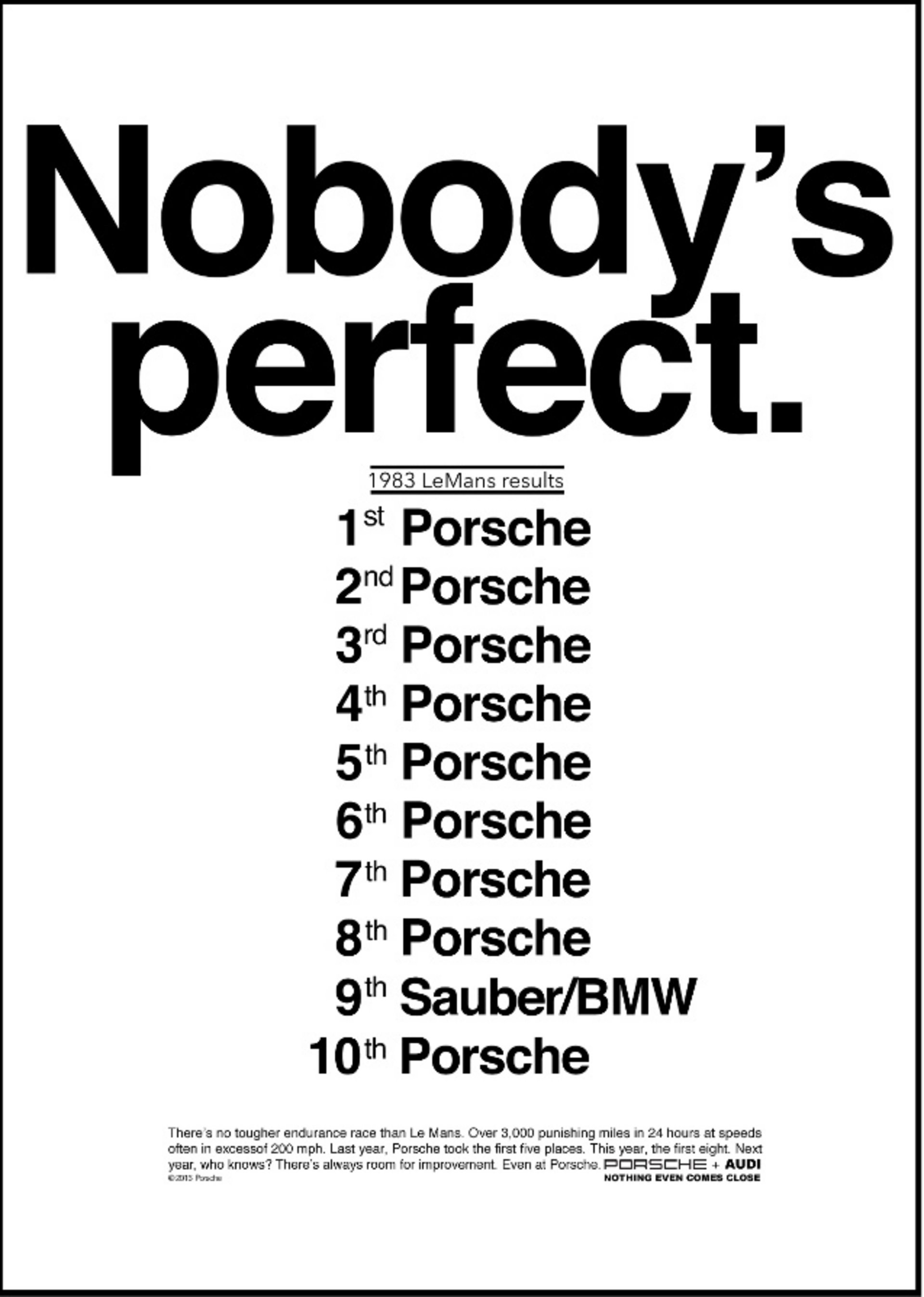 Εμμένοντας λίγο ακόμα στην Porsche, όντας κυρίαρχη για μεγάλο χρονικό διάστημα σε διάφορους αγώνες και ειδικά στο LeMans, το 1983, με το πέρας του 24ώρου, κυκλοφόρησε τη Nobody’s perfect αφίσα της που άφησε εποχή. Στις θέσεις 1-8 και στη 10 φιγουράριζαν αγωνιστικά της φίρμας, ενώ στη θέση 9 υπήρχε μία Sauber/ BMW, να χαλάει την ομοιομορφία… Αυτήν ακριβώς τη φιλοσοφία ακολούθησε στο Le Mans του 2013, για την κατηγορία LMP-2, η Nissan. Αν και με όχι το ίδιο εντυπωσιακό αποτέλεσμα.