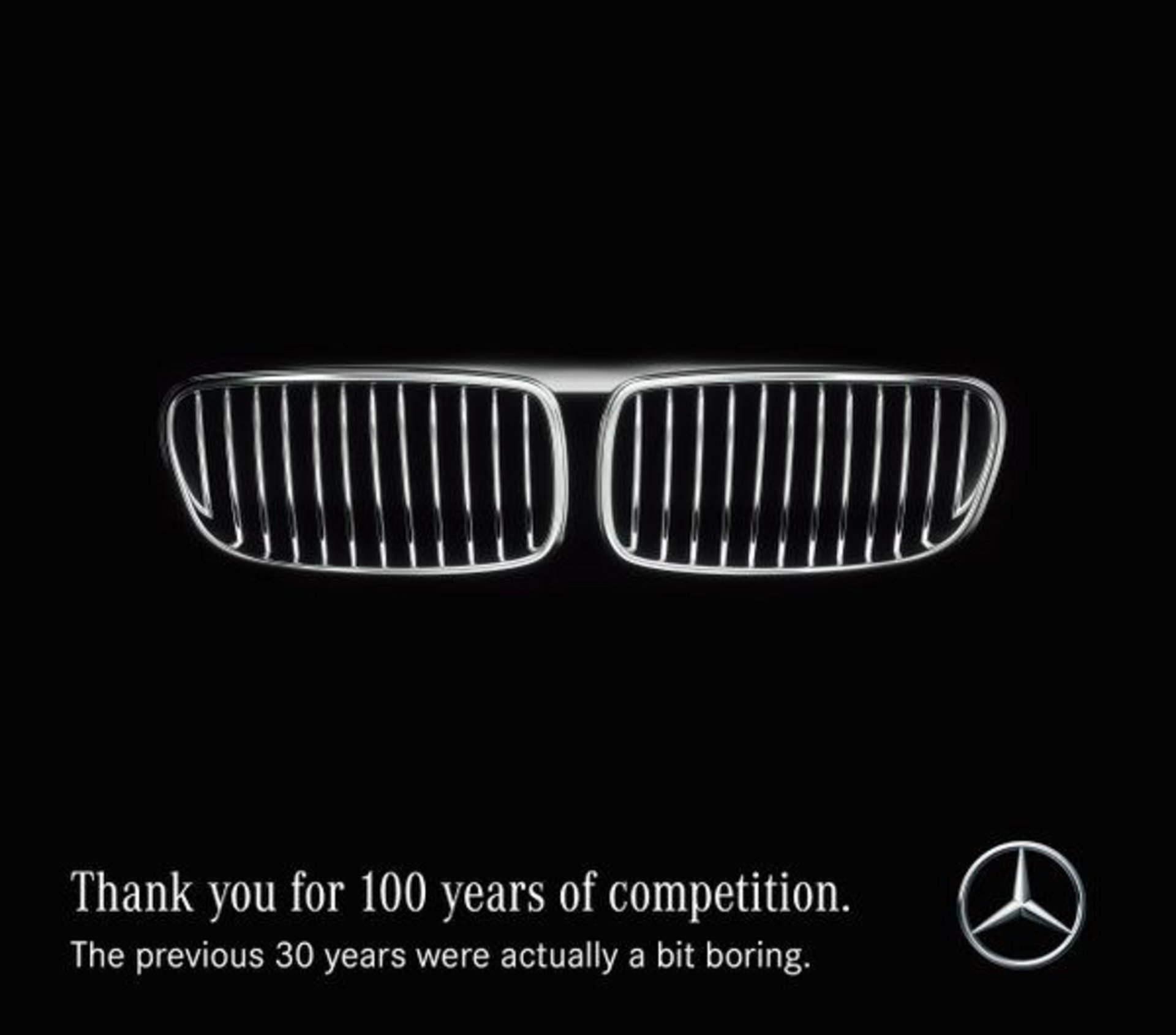 Προφανώς γκουγλάροντας μπορείτε να βρείτε διάφορα μεταξύ των δύο αυτών εταιριών. Εμείς επιλέξαμε να σας δείξουμε δύο καταχωρήσεις, η πρώτη, της BMW, αναφέρει ότι και μία Mercedes μπορεί να φέρει οδηγική απόλαυση, δείχνοντας ένα τράκτορα Mercedes να κουβαλάει αυτοκίνητα BMW… Η δεύτερη, στα 100 χρόνια της BMW, την ευχαρίστησε για το μεταξύ τους ανταγωνισμό, καθώς τα πρώτα 30 χρόνια της ύπαρξής της ένιωθε κάπως μοναχικά…
