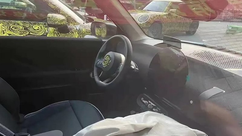 Στο εσωτερικό, διακρίνεται μια μεγάλη κυκλική οθόνη στην κεντρική κονσόλα και ένα head-up display πίσω από το τιμόνι.
