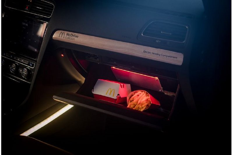 Το σκούρο πράσινο VW e-Golf με τις κίτρινες λωρίδες, με αισθητήρες στάθμευσης και κάμερες για ελιγμούς σε ένα μικρό χώρο (και κατά συνέπεια στην προσέγγιση του ταμείου παραγγελιών και του χώρου στάθμευσης του εστιατορίου), κλιματιζόμενες θέσεις για ποτηράκια και ένα τραπέζι “click-to-install” στο εσωτερικό για τις απαιτήσεις όσων αρέσκονται να τρώνε στο αυτοκίνητο.