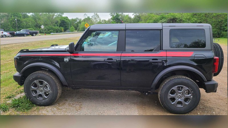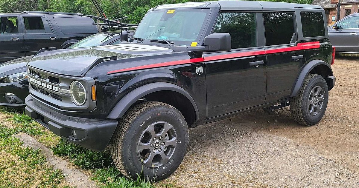Οι φωτογραφίες δείχνουν ένα Ford Bronco Big Bend με μία κόκκινη λωρίδα Roush στο πλάι και ένα γκρι αυτοκόλλητο πάνω από το παρμπρίζ στο εμπρός άκρο της οροφής. Αυτά τα αυτοκόλλητα είναι τα μόνα ορατά στοιχεία της Roush.