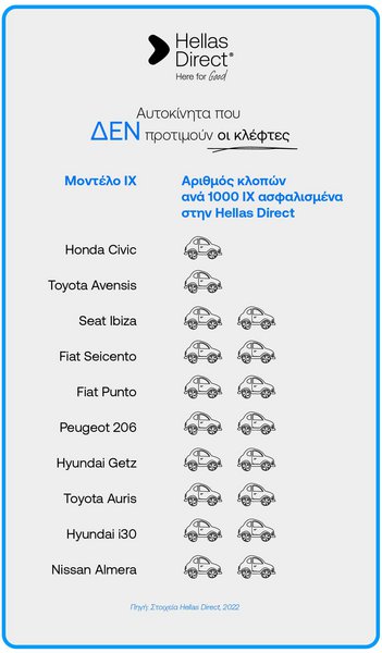 Η σχετική λίστα παρουσιάζει τον αριθμό κλοπών ανά 1.000 ΙΧ ασφαλισμένα στην Hellas Direct. Τις λιγότερες κλοπές είχαν τα Honda Civic και Toyota Avensis (με μόλις 1 ανά 1.000 οχήματα) και ακολούθησαν τα SEAT Ibiza, FIAT Seicento, FIAT Punto, Peugeot 206, Hyundai Getz, Toyota Auris, Hyundai i30 και Nissan Almera, με 2 κλοπές ανά 1.000 αυτοκίνητα.