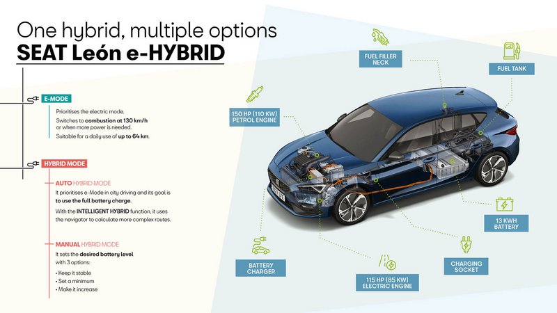 Το σύστημα πρόωσης του υβριδικού Leon που «μπαίνει» και στην πρίζα βασίζεται σε ένα 1.4 TSI ισχύος 150 PS που συνδυάζεται με ένα ηλεκτρικό μοτέρ 85 kW. H μεικτή ισχύς του συστήματος είναι στα 204 PS και μια μπαταρία 13 kWh επαναφορτίζεται σε οικιακή πρίζα (6 ώρες) ή σε wallbox (3,5 ώρες).