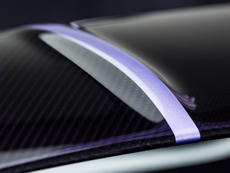 Ιδιαίτερο ενδιαφέρον παρουσιάζει η χρήση ανθρακονήματος με διακριτική βιολετί απόχρωση, μια λεπτομέρεια που απαιτεί υψηλή τεχνογνωσία στην κατασκευή και επεξεργασία των υλικών. Το ίδιο χρώμα επαναλαμβάνεται και στις δαγκάνες των φρένων, δημιουργώντας μια συνεκτική εικόνα χωρίς να γίνεται επιδεικτική.