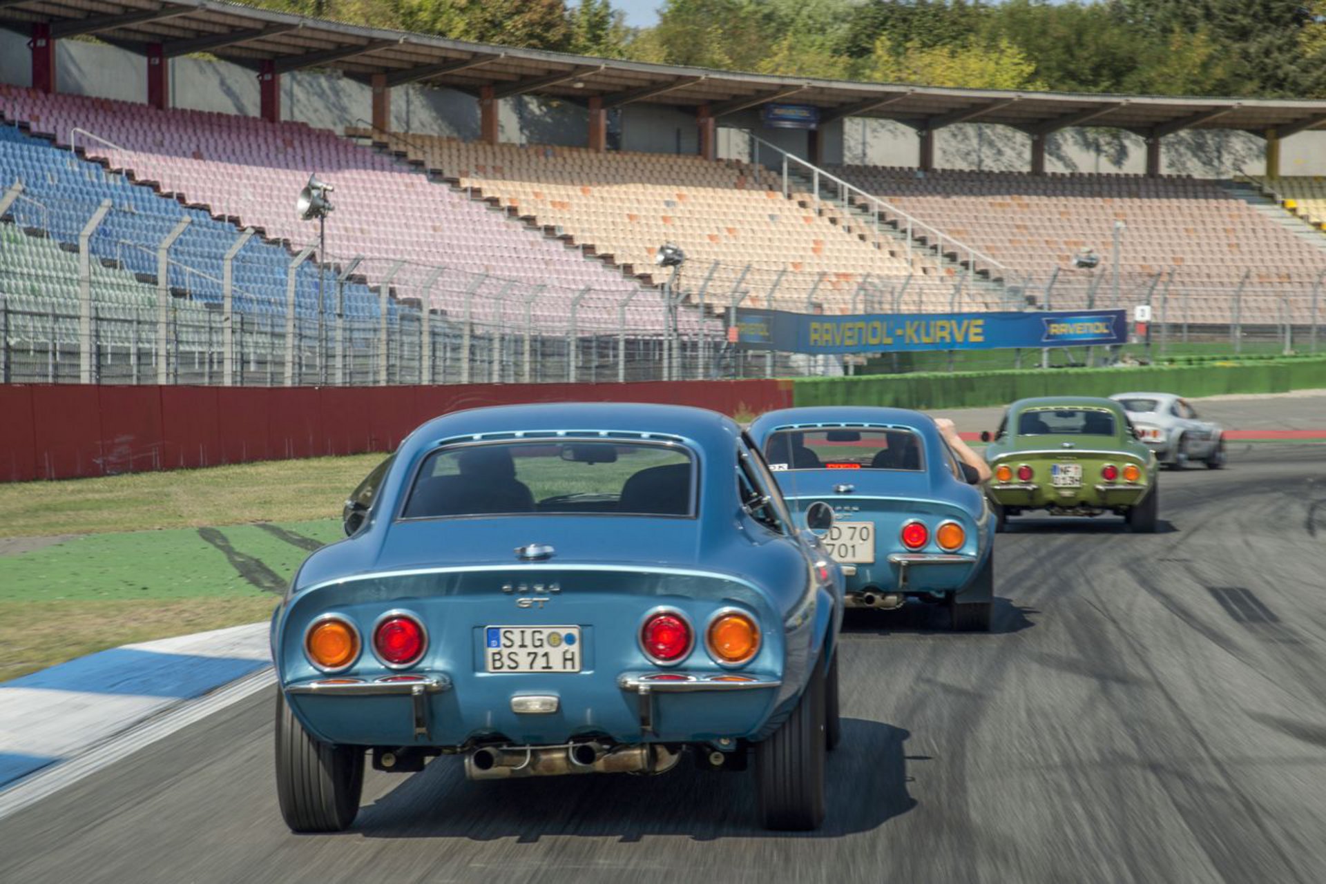 Για μία ώρα, το Hockenheimring έκανε ένα διάλειμμα από την καθημερινή του ρουτίνα. Οι ομάδες δοκιμών με τις αγωνιστικές φόρμουλες και τα αυτοκίνητα τουρισμού άφησαν για λίγο τα «εργαλεία» τους και παρατάχθηκαν κατά μήκος του τοίχου των pits για να απολαύσουν το θέαμα: 75 αναλλοίωτα στο χρόνο Opel GT από όλη την Ευρώπη να διασχίζουν με μεγάλη ταχύτητα τη γραμμή εκκίνησης μέχρι τον τερματισμό. Η Opel Classic έφερε το αρχαιότερο GT από το 1968 («το Νο 1») και το νεότερο από το 1973. Επικεφαλής τέθηκε ο Walter Röhrl, παγκόσμιος πρωταθλητής ράλι το 1982 με ένα Opel Ascona 400 και με συνοδηγό τον σχεδιαστή του GT, Erhard Schnell. Οι δυο τους κάθισαν στο προσωπικό, ασημί Opel GT του Röhrl. Ο θρύλος των αγώνων για την Opel, Volker Strycek, ήταν επίσης εκεί, με το δικό του Opel GT Junior με σπάνιες εκδόσεις (tuning) των βελτιωτικών οίκων Irmscher και Conrero να αποτελούν ξεχωριστές παρουσίες. Όλοι τους ήταν και είναι τμήμα του Grand Tour, που διοργανώνεται από το Σύνδεσμο Ευρωπαϊκών Λεσχών GT μεταξύ 19 και 22 Σεπτεμβρίου. Ο τελικός θα πραγματοποιηθεί το Σάββατο στο Κέντρο Δοκιμών της Opel στο Dudenhofen.