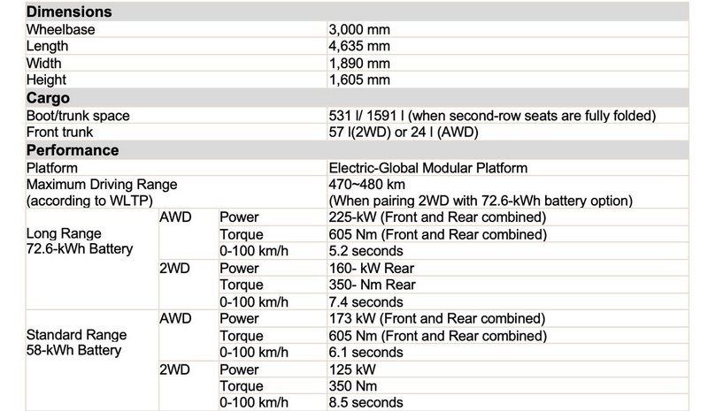 Σχετικά με το σύστημα πρόωσης υπάρχουν τέσσερις εκδόσεις με κίνηση μπροστά ή στους τέσσερις τροχούς και δύο μεγέθη μπαταριών και την αυτονομία να φτάνει τα 480 km. Όπως μπορείτε να δείτε στο παρακάτω πίνακα (φαίνονται και οι επιδόσεις) η έκδοση μπαταρίας 72,6 kWh έχει συνδυασμένη ισχύ 225 kW στην τετρακίνητη έκδοση με τα δύο ηλεκτρικά μοτέρ και 160 kW στην πισωκίνητη έκδοση με τα 160 kW.