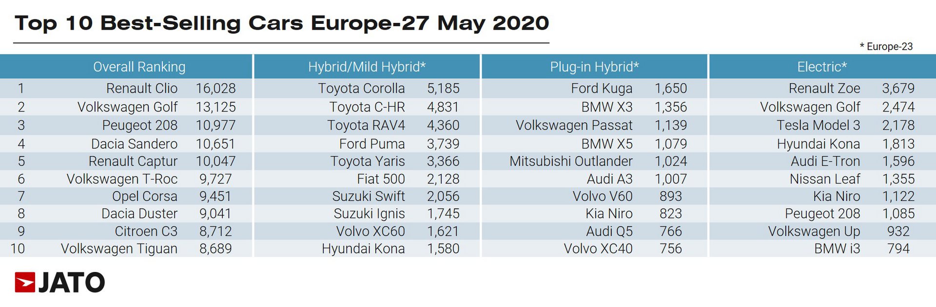 Συλλέγοντας τα στοιχεία από τις επιμέρους ευρωπαϊκές αγορές, το νο. 1 μοντέλο σε πωλήσεις για το Μάιο ήταν το νέο Renault Clio. Καταγράφοντας 16.028 ταξινομήσεις άφησε αρκετά πίσω του, στη δεύτερη θέση, το Volkswagen Golf (13.125 ταξινομήσεις). Στην τρίτη θέση βρέθηκε το Peugeot 208 (10.997 ταξινομήσεις), στην τέταρτη το Dacia Sandero (10.651 ταξινομήσεις), ενώ στην πέμπτη ανέβηκε ένα ακόμα μοντέλο της Renault, το Captur (10.047 ταξινομήσεις).