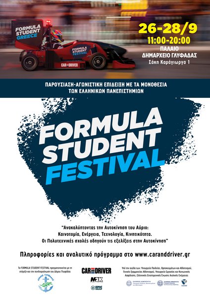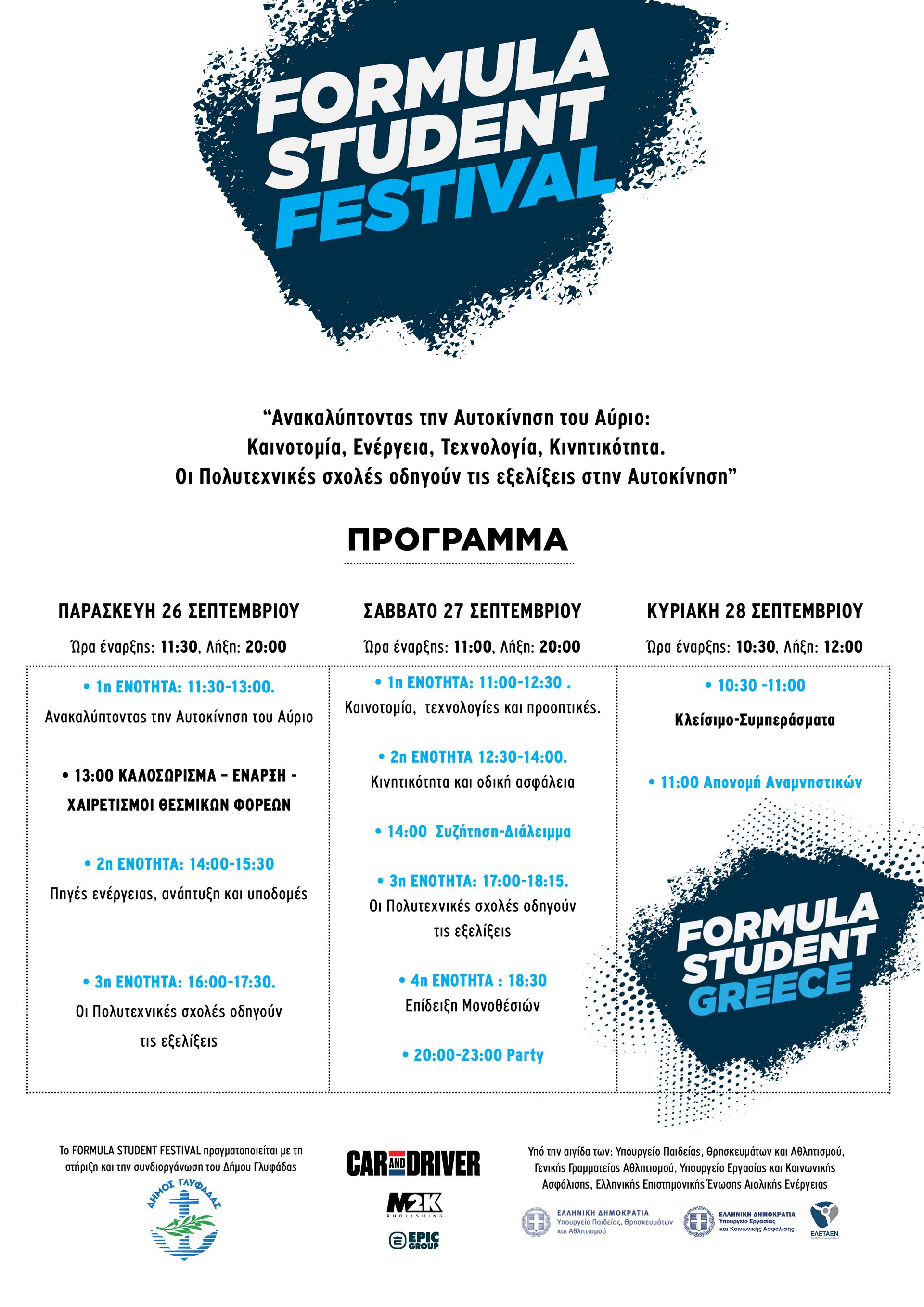 Το Formula Student Festival - με θέμα «Ανακαλύπτοντας την Αυτοκίνηση του Αύριο: Καινοτομία, Ενέργεια, Τεχνολογία, Κινητικότητα. Οι Πολυτεχνικές σχολές οδηγούν τις εξελίξεις στην Αυτοκίνηση» - θα διεξαχθεί από την Παρασκευή 26 Σεπτεμβρίου έως και την Κυριακή 28 Σεπτεμβρίου 2025 στο χώρο του παλαιού Δημαρχείου στη Γλυφάδα, με την υποστήριξη και τη συνεργασία του Δήμου Γλυφάδας, ενώ πραγματοποιείται με τις αιγίδες του Υπουργείου Παιδείας Θρησκευμάτων και Αθλητισμού, του Υπουργείου Εργασίας και Κοινωνικής Ασφάλισης, της Γενικής Γραμματείας Αθλητισμού καθώς και της Επιστημονικής Ένωσης Αιολικής Ενέργειας (ΕΛΕΤΑΕΝ).