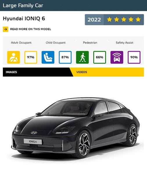 Το Hyundai IONIQ 6 πέτυχε εξαιρετικά υψηλά αποτελέσματα στην Προστασία Ενηλίκων Επιβατών με 97%. Πλήρως ηλεκτρικό και με τις πιο πρόσφατες τεχνολογίες ασφάλειας, το IONIQ 6 ακολουθεί σίγουρα την τροχιά των πρόσφατων εξελίξεων στην αυτοκινητοβιομηχανία. Για παιδιά επιβάτες, το IONIQ 6 παρείχε καλή προστασία για όλες τις κρίσιμες περιοχές του σώματος τόσο των ανδρείκελων ηλικίας 6 όσο και 10 ετών στις δοκιμές μετωπικής μετατόπισης και πλευρικής σύγκρουσης και συγκέντρωσε μέγιστους βαθμούς σε αυτό το μέρος της αξιολόγησης.