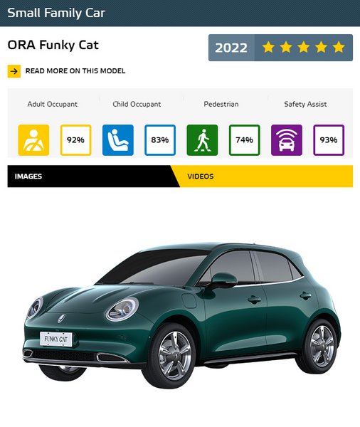 Στην κατηγορία Small Family Car, το ORA Funky Cat είναι εξαιρετικά εξοπλισμένο ηλεκτρικό compact car και, όντας στην κορυφή της κατηγορίας του, ξεπέρασε πολλές γνωστές μάρκες. Κατασκευάζεται από την Great Wall Motors και για πρώτη φορά παρουσιάστηκε το 2020. Ο ηλεκτροκινητήρας του αποδίδει 143 PS και 210 Nm, ενώ η μπαταρία ιόντων λιθίου 47,8 kWh του χαρίζει αυτονομία 400 km, βάσει, ωστόσο, του προηγούμενου προτύπου NEDC, ενώ διατίθεται και με μπαταρία 63,1 kWh, που ανεβάζει την αυτονομία στα 500 km.