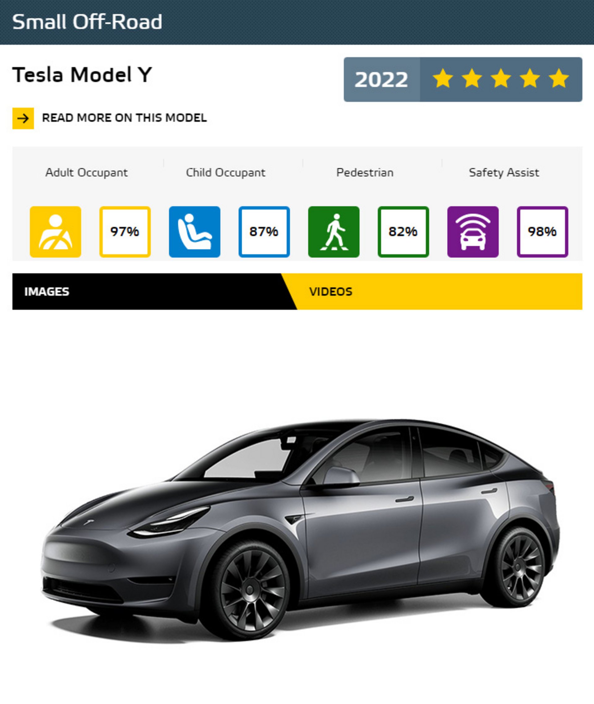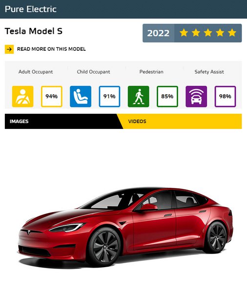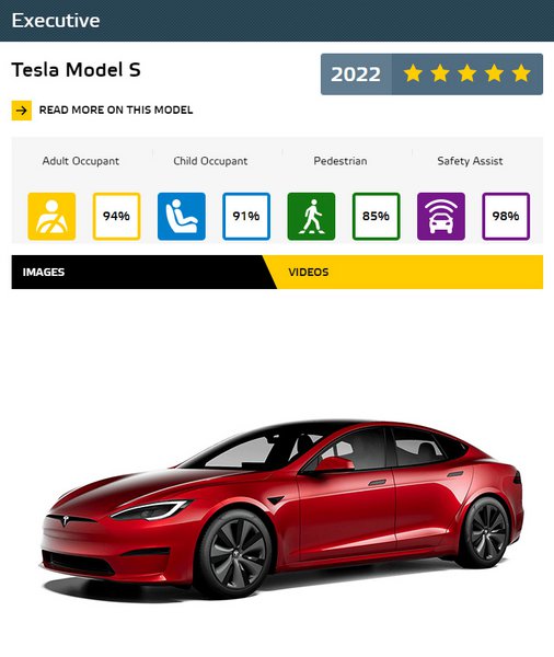 Από την πλευρά της, η Tesla μπορεί να υπερηφανεύεται ότι έχει δύο δικά της μοντέλα στα κορυφαία. Το Model S και το Model Y έχουν υψηλές επιδόσεις στην Προστασία Ενηλίκων Επιβατών και πέτυχαν την υψηλότερη βαθμολογία 98% στο Safety Assist από όλα τα οχήματα αυτής της λίστας. Το Tesla Model S είναι επίσης το καλύτερο μοντέλο στην κατηγορία του στην κατηγορία Pure Electric.