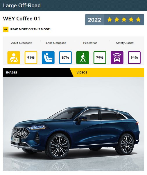 Το δεύτερο αυτοκίνητο κινεζικής μάρκας στη λίστα με τα καλύτερα είναι το WEY Coffee 01. Πρόκειται για 2λιτρο υπερτροφοδοτούμενο plug-in hybrid SUV με 2 ηλεκτροκινητήρες, με ηλεκτρική αυτονομία 146 km. Το υβριδικό κινητήριο σύνολο του κορυφαίου off-road, κατά Euro NCAP, αποδίδει 476 PS και επιταχύνει από 0-100 km/h σε μόλις 5,0 sec. ενώ έχει τελική ταχύτητα 235 km/h. Αξίζει να σημειωθεί ότι η WEY είναι η premium SUV brand της Great Wall Motor. Το Euro NCAP επισημαίνει ότι πολύ κοντά σε βαθμολογία ήταν το Lexus RX.