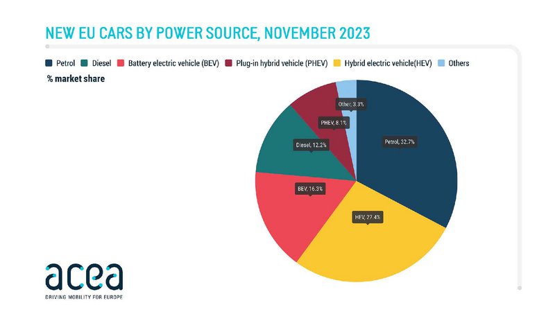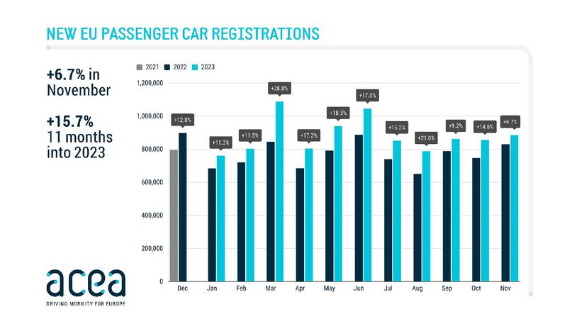 Το ξέφρενο ράλι ανόδου των ταξινομήσεων νέων αυτοκινήτων στην Ευρωπαϊκή Ένωση μετριάστηκε τον Νοέμβριο του 2023. Ωστόσο, έστω και με (μειωμένο, σε σχέση με προηγούμενους μήνες) ποσοστό 6,7% σε σχέση με τον Νοέμβριο του 2022, η ανοδική τάση συνεχίστηκε για 16ο σερί μήνα.